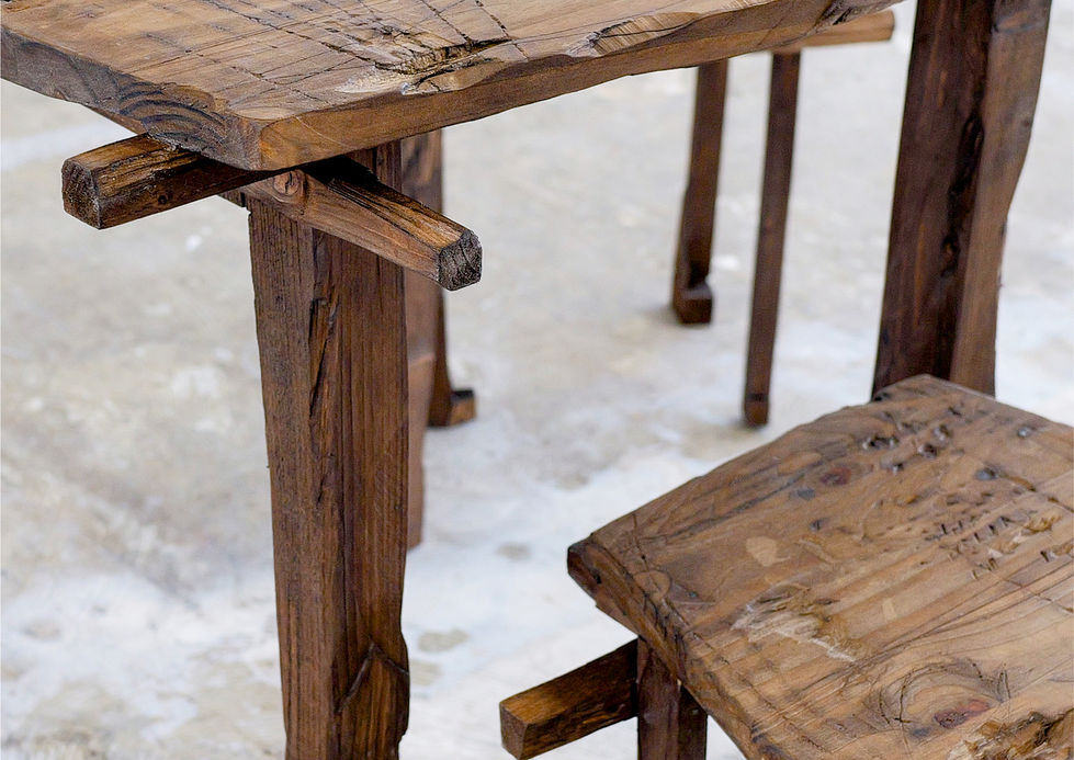 Stained wood table and two chairs 75x80x80cm (table), 95x45x42cm (chairs)
